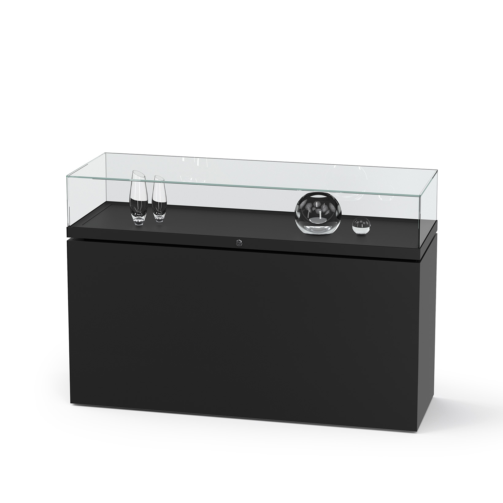 Tischvitrine Glas mit abschließbarem Unterschrank Rahmenlose Ganzglas-Konstruktion mit 8mm ESG-SicherheitsglasUnsere Stauraum-VitrineDesign-Vitrine für Museen, Ausstellungen oder das exklusive Büro Unterschrank aus beschichteter Holzplatte Größen B/H/T1000 × 970 × 500 mm1200 × 970 × 500 mm1400 × 970 × 500 mmHöhe des Glaskorpus 220 mmÖffnung - Glaskorpus aufklappbar mit seitlichen Gasdrucköffnern, die den Aufbau arretierenVerglasung - Einscheiben-Sicherheitsglas / ESGOberfläche – schwarz - optional: weiß oder hellgrauBeleuchtung - ohne Beleuchtung - optional: waagerechte Stahlerschiene mit LED-Strahlern, inkl. TrafoSchließung - Sicherheitsschlößer mit je 2 Schlüsseln
