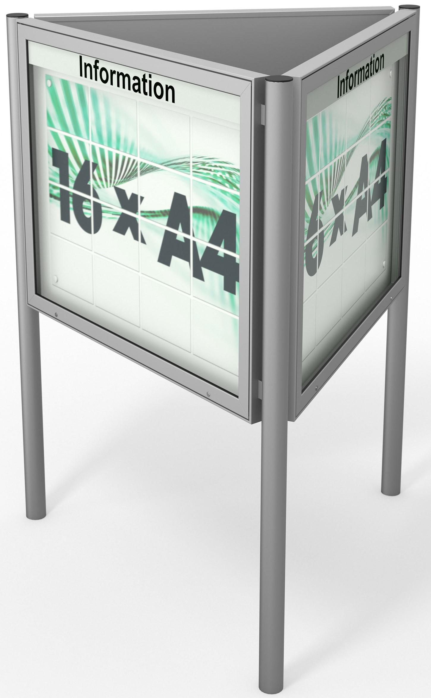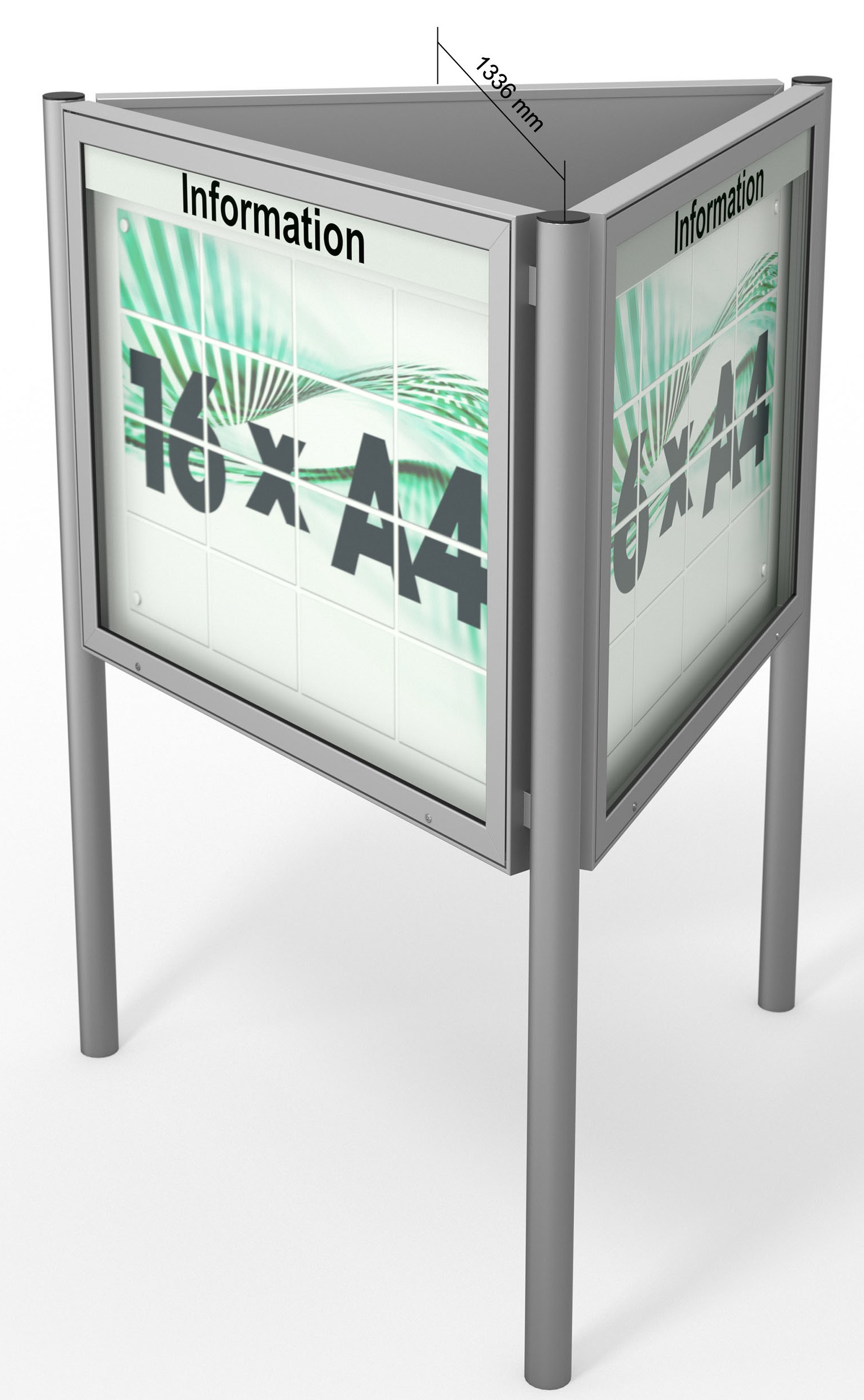 Schaukasten Plenum - eckig - Dreiecksanlage 65 mm Gehäusetiefe -wetterfester, robuster SchaukastenUmfangreiches Zubehör wie Beleuchtung und StänderGrößen B/H3 x 16 × DIN A4 • 1330 × 1080 mm oder3 x 21 × DIN A4 • 1600 × 1130 mm Oberfläche - Eloxierung in matt-silber (E6/EV1)Optionale Standbeine - Die Standbeine müssen 700 mm tief in Betonfundamente eingefasst werdenBeleuchtung – optionale LED-Langfeldleuchte Öffnung - Nach oben öffnender Klappflügel, unterstützt durch Gasdruckfedern mit automatischer Arretierung in geöffneter StellungVerglasung - Einscheiben-Sicherheitsglas / ESG Textblende - unbeschriftete, weiße Acryl-TextblendeSchließung - Sicherheitsschlösser mit je 2 SchlüsselnMontage - Vorgerichtet zur Wandmontage - freistehend mit runden Standbeinen zum EinbetonierenRückwand - weiße, magnethaftende Rückwand mit 10 Magneten